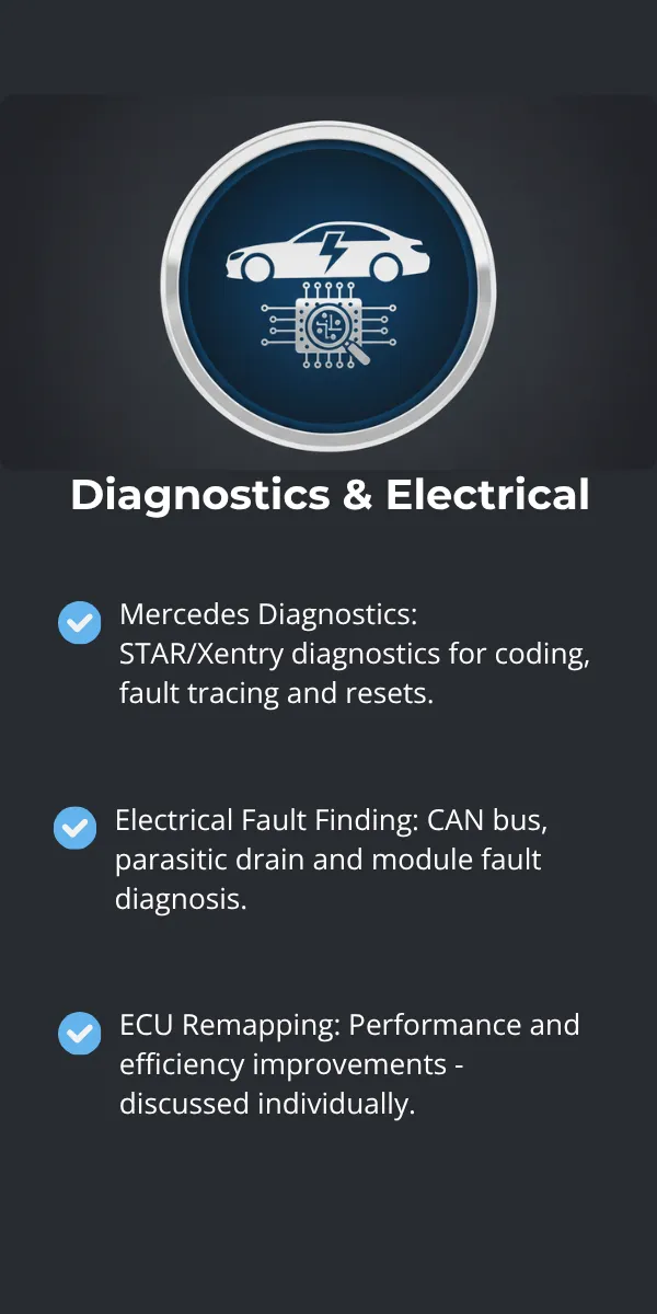 Mercedes Diagnostics: STAR/Xentry diagnostics for coding, fault tracing and resets.