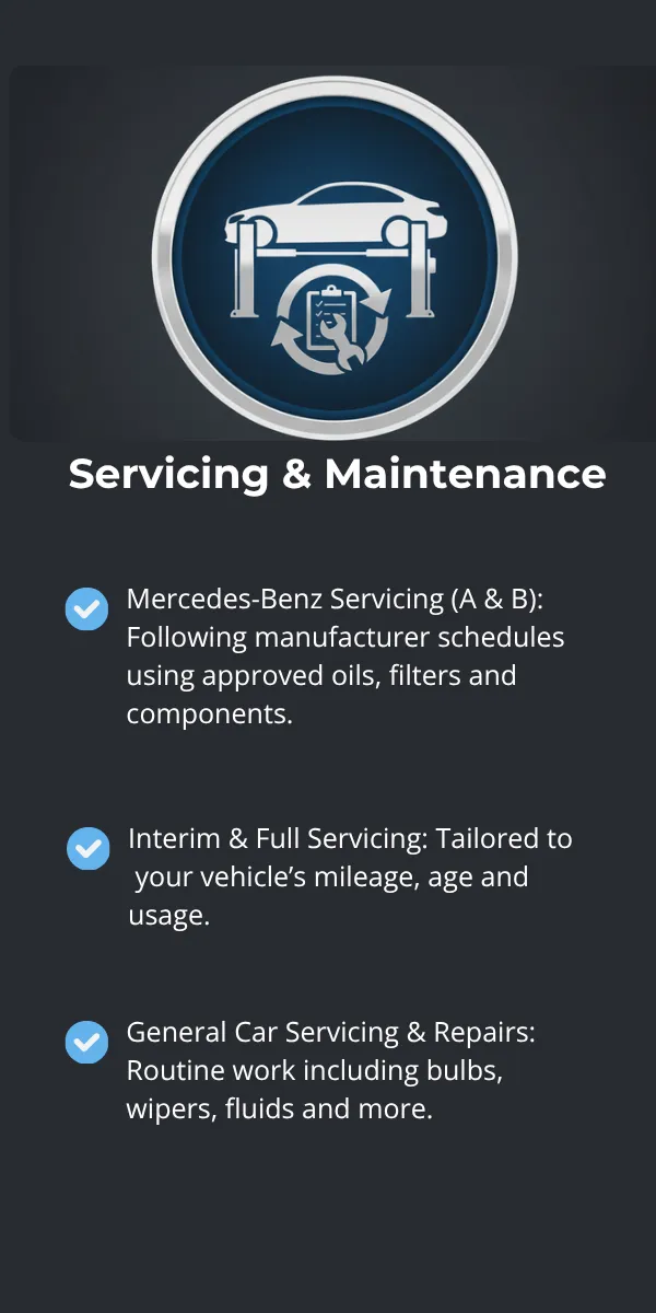 Mercedes-Benz Servicing (A & B): Following manufacturer schedules using approved oils, filters and components.